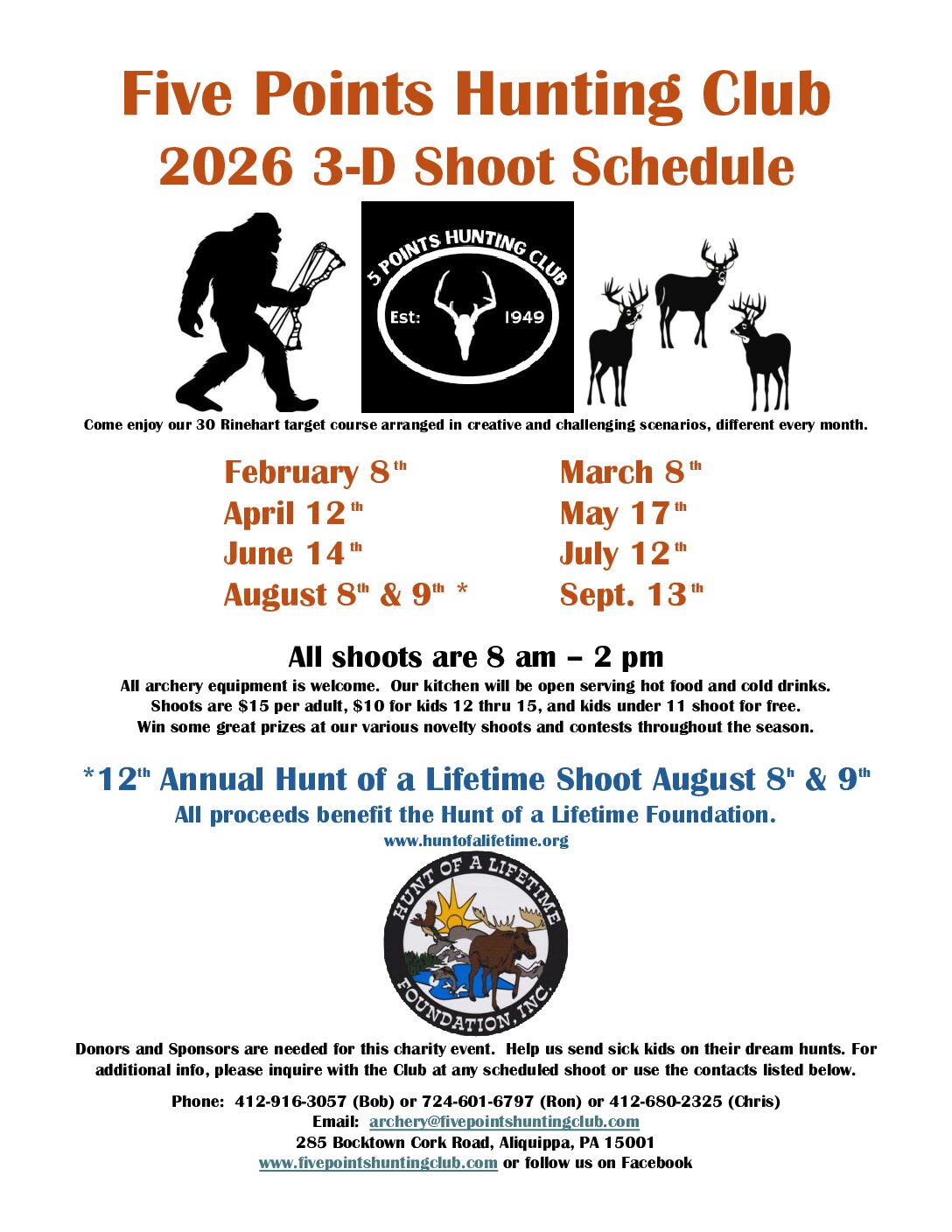 Five Points holds monthly 3-D shoots from February threw September. Check our calendar for dates and times. Non members are welcome for a nominal fee. Five Points has an indoor range, an outdoor practice area for fine tuning your bow and our outstanding 3-D course is set up monthly as stated above. August Five Points holds an annual 2 day, 3-D shoot which benefits the HUNT OF A LIFETIME foundation. BIG NEWS for the upcoming 3-D season at 5 Points… That’s right, crossbow shooters will be welcome at all of our 2026 events!